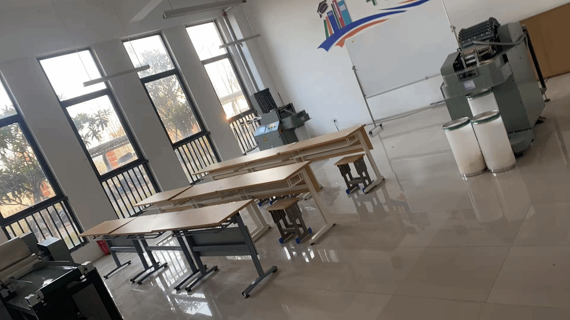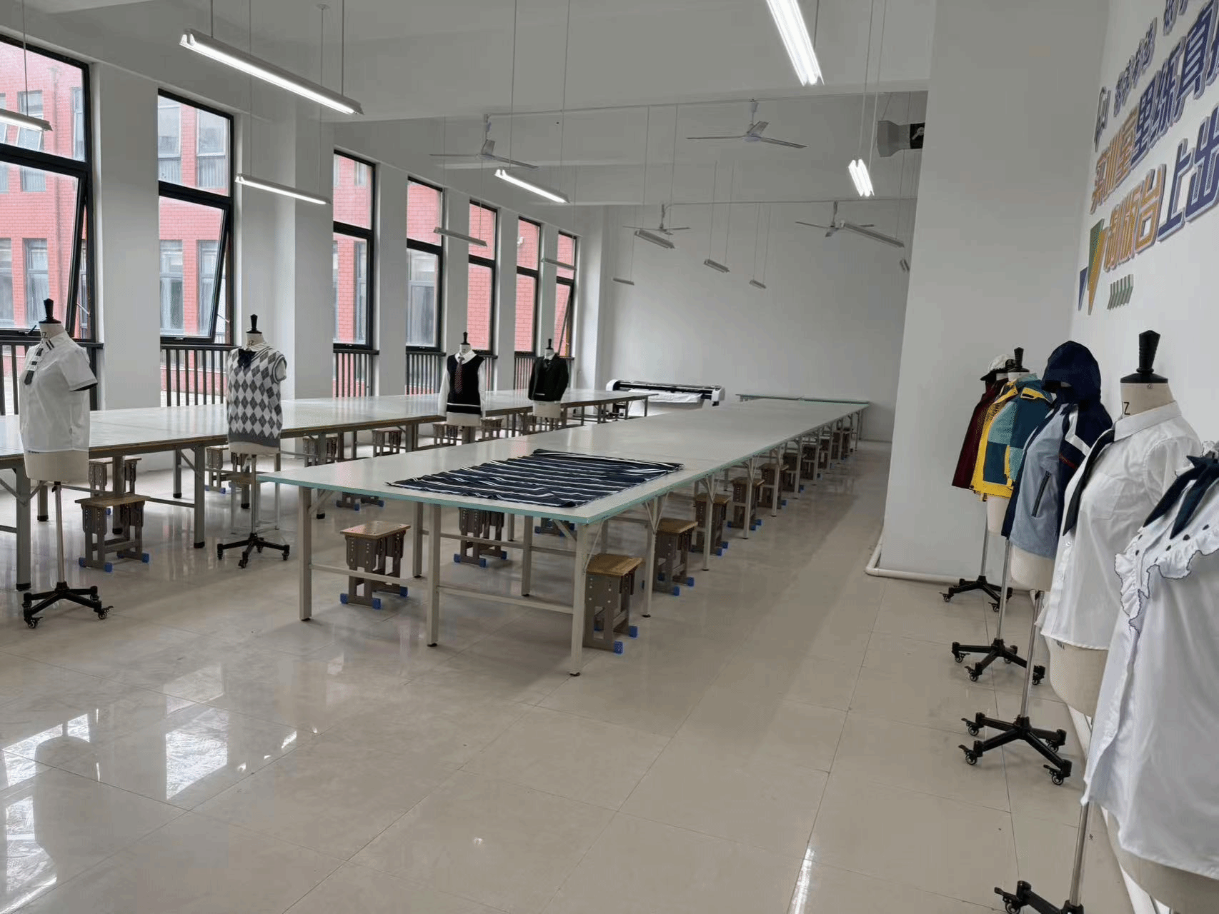 实训室配备了专业打板桌、标准人台、数字化绘图仪及高清智慧屏,构建了理实一体化的教学环境,学生可在此进行纸样打板、立体裁剪、版型调整,还可以通过绘图仪输出1:1工业样板。着重培养学生解决真实问题的综合能力,实现了“学中做、做中学”的现代教学理念。