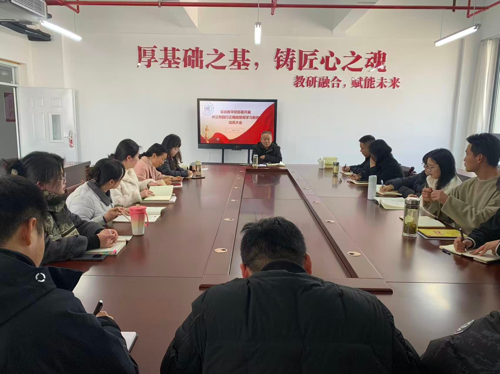 为深入学习贯彻习近平总书记关于树立和践行正确政绩观的重要论述,全面落实学院党委工作部署,2026年3月10日下午基础教教学部党总支召开树立和践行正确政绩观学习教育动员部署会,对学习教育进行全面动员、系统安排。部党总支书记曹明贵主持会议并讲话,全体党员干部、教师参会。