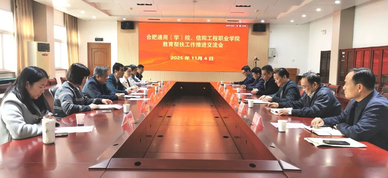 为认真落实教育帮扶工作,11月4日上午, 合肥通用机械研究院、合肥通用职业技术学院与信阳工程职业学院教育帮扶工作推进交流会在合肥通用职业技术学院举行。合肥通用职业技术学院党委书记田启昌,合肥机械研究院党委工作部副部长王信,合肥通用职业技术学院副院长蒋腊芳、机械工程系主任张荣花、电气与信息工程系主任何旭、招生就业办副主任谷宗全,信阳工程职业学院党工委委员、监事会监事长张卫兵,机电与信息工程学院院长王吉周、纺织服装学院院长陶新南、汽车工程学院院长李翔、党工委办公室主任马健、就业创业指导中心副主任孙治磊参加会议。会议由合肥通用职业技术学院副院长肖艳君主持。