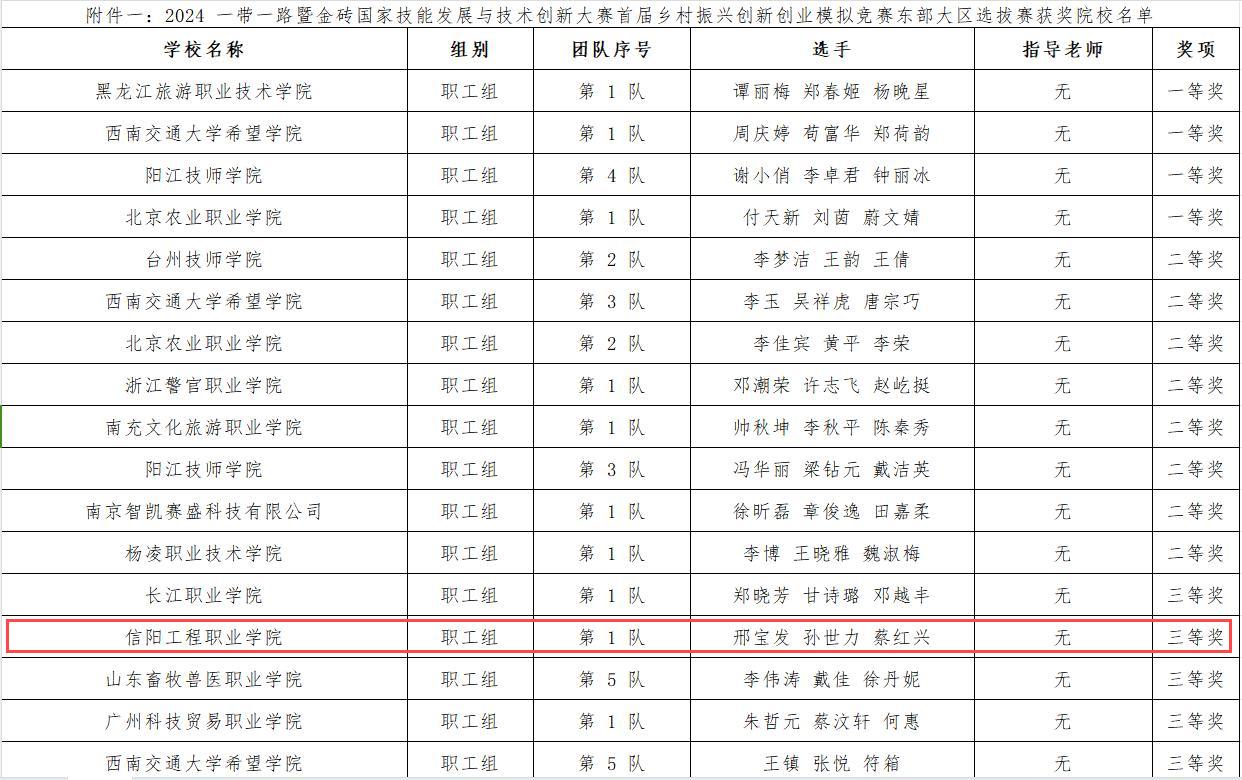 近日,2024一带一路暨金砖国家技能发展与技术创新大赛之首届乡村振兴创新创业模拟竞赛选拔赛顺利落下帷幕。经过层层选拔和激烈角逐,信阳工程职业学院经济与艺术系教师邢宝发、孙世力、蔡红兴组成的教师团队在模拟竞赛东部大区选拔赛中获得三等奖,排名第14名,顺利进入国赛。