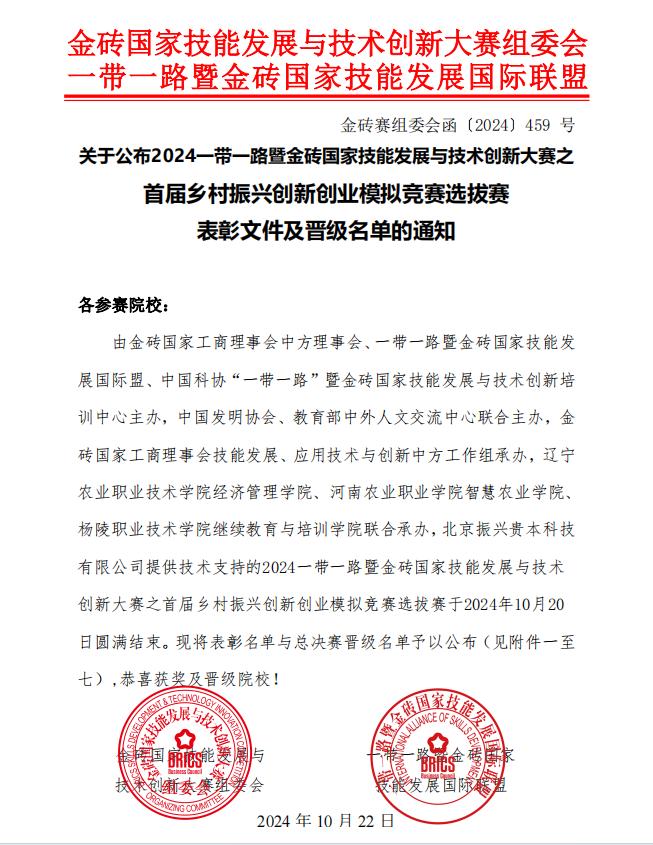 近日,2024一带一路暨金砖国家技能发展与技术创新大赛之首届乡村振兴创新创业模拟竞赛选拔赛顺利落下帷幕。经过层层选拔和激烈角逐,信阳工程职业学院经济与艺术系教师邢宝发、孙世力、蔡红兴组成的教师团队在模拟竞赛东部大区选拔赛中获得三等奖,排名第14名,顺利进入国赛。