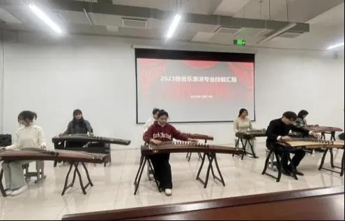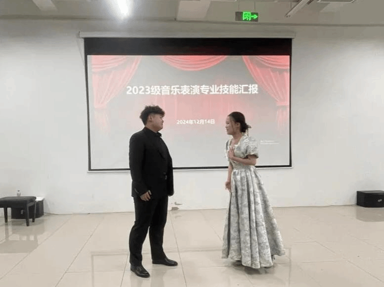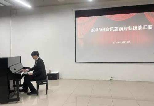 12月14日晚,2023级音乐表演专业技能汇报在鲁班楼一楼阶梯教室精彩上演,近40名学生在汇演中展示了声乐、器乐学习成果,为现场观众带来了一场视听盛宴。经济与艺术系全体师生参加了此次活动。