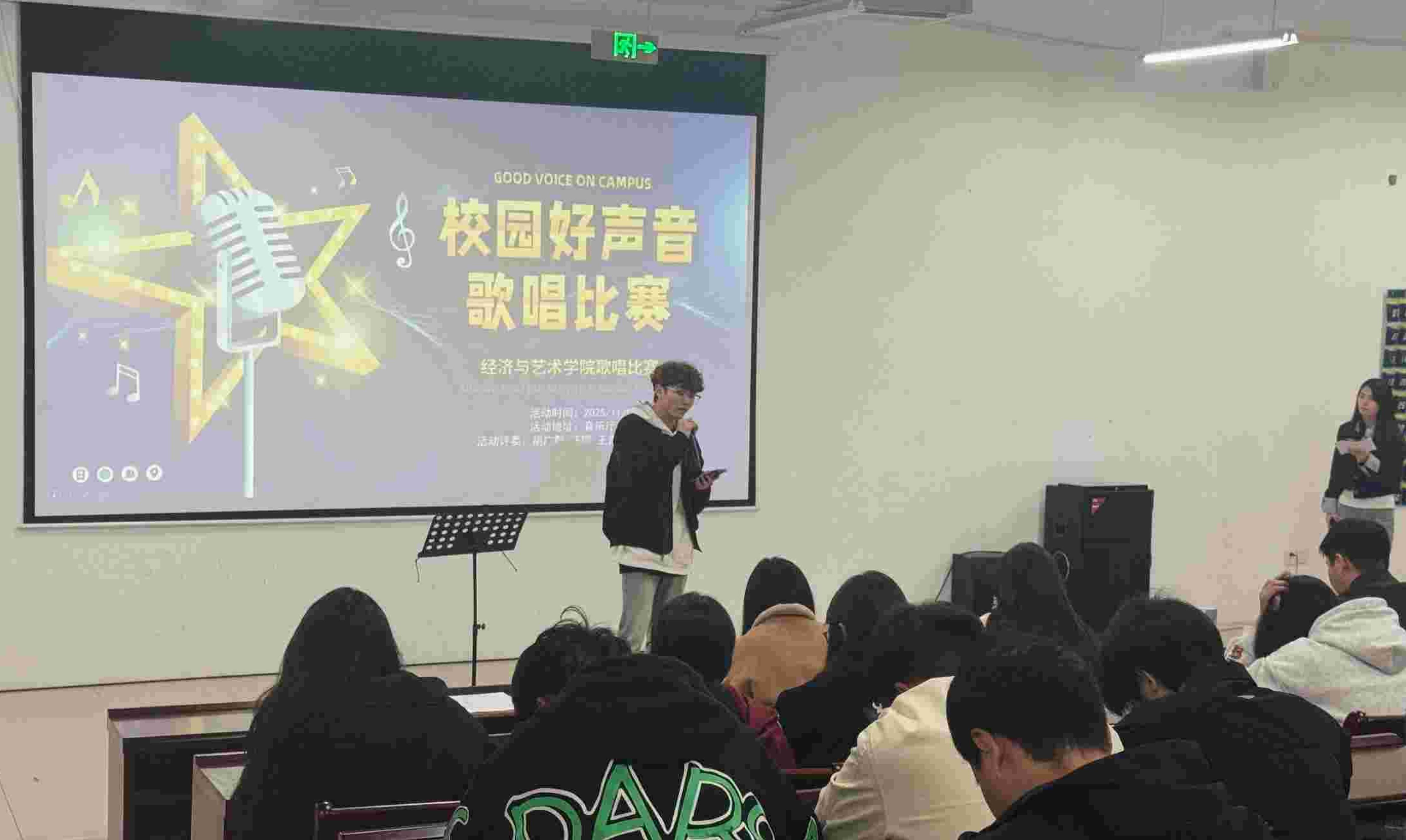 为丰富校园文化生活,营造积极向上、至善至美的校园艺术氛围。11月9日下午,由经济与艺术学院共青团委员会主办的《校园好声音,歌唱比赛》校园歌手选拔赛在鲁班楼音乐厅隆重举行。本次大赛特邀经济与艺术学院学管副院长胡广群老师、教学秘书汪鹏老师、24级辅导员王苗苗老师、25级辅导员闫宇航老师担任评委。比赛由25级跨境电子商务专业李菲菲同学主持。经过激烈角逐,5名选手脱颖而出,晋级校园决赛。