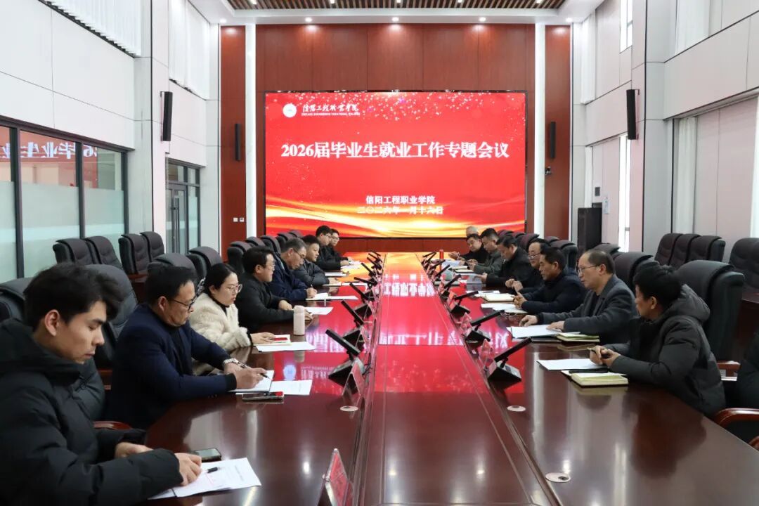 1月16日下午,信阳工程职业学院在炎培楼七楼会议室召开2026届毕业生就业工作专题会议。会议旨在深入贯彻党中央及省委、省政府关于促进高质量充分就业的决策部署,全面部署学校2026届毕业生就业工作,动员全校上下协同发力,扎实推动毕业生更加充分、更高质量就业。