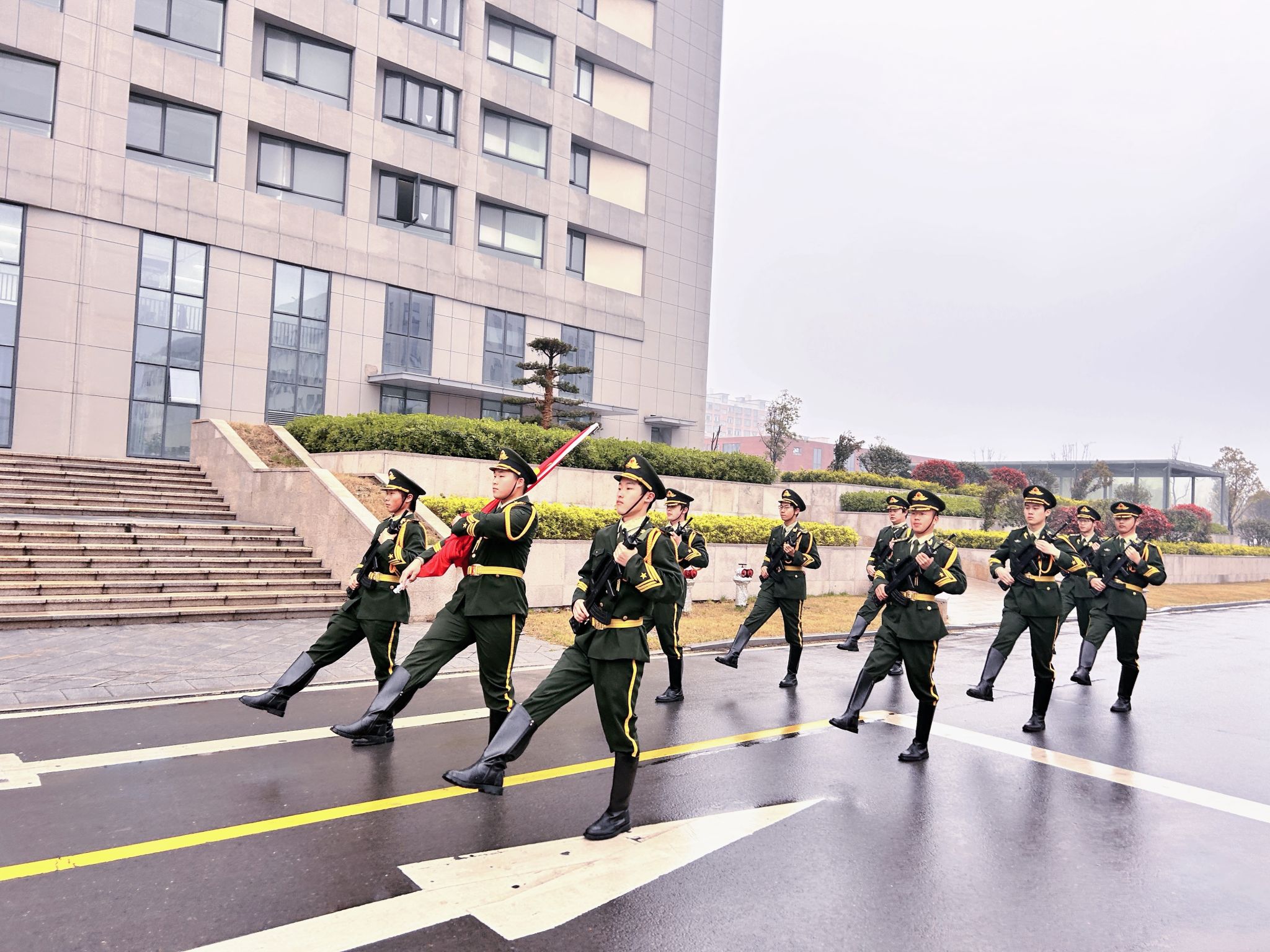 仪式伊始,校国旗护卫队队员迈着铿锵有力、整齐划一的步伐,护卫着五星红旗走向升旗台。伴随着雄壮嘹亮的《义勇军进行曲》,鲜艳的五星红旗冉冉升起、迎风飘扬,全体师生肃立注目,行注目礼,心中满是对祖国的热爱与对先烈的缅怀。