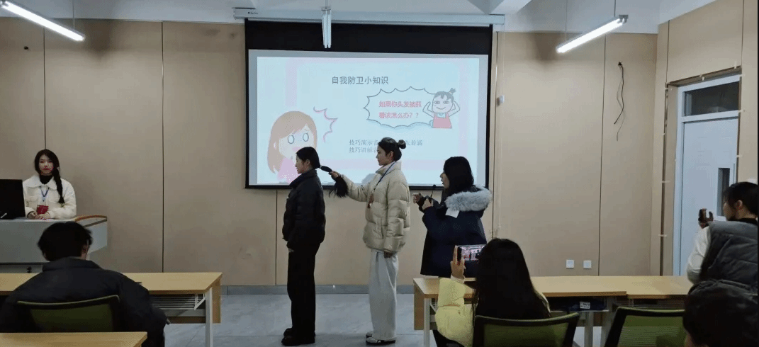 讲座还现场插入演示环节。女工部的三位同学上台演示了“如果你被抓着头发你该怎么办?”等应对策略,并详细讲解了每一步的操作步骤。随后三位同学则演示了“被人从后面抱住怎样挣脱”的技巧,同样进行了详细的步骤讲解。这些生动直观的演示,让同学们对自我防卫技巧有了更加直观的感受和理解。