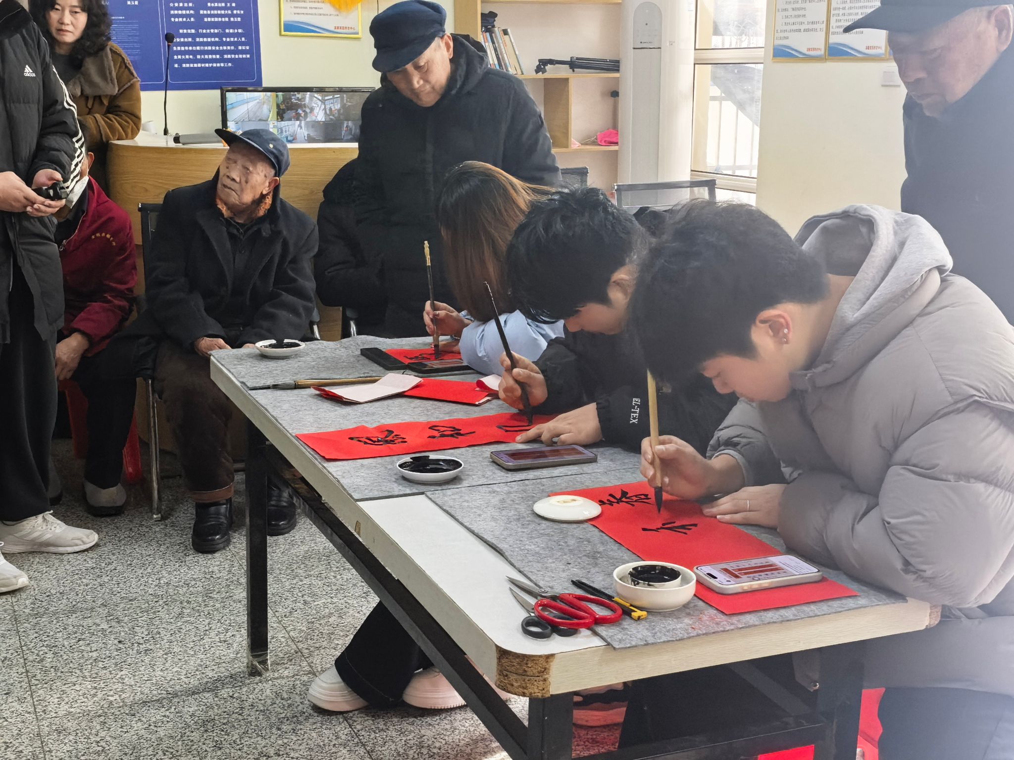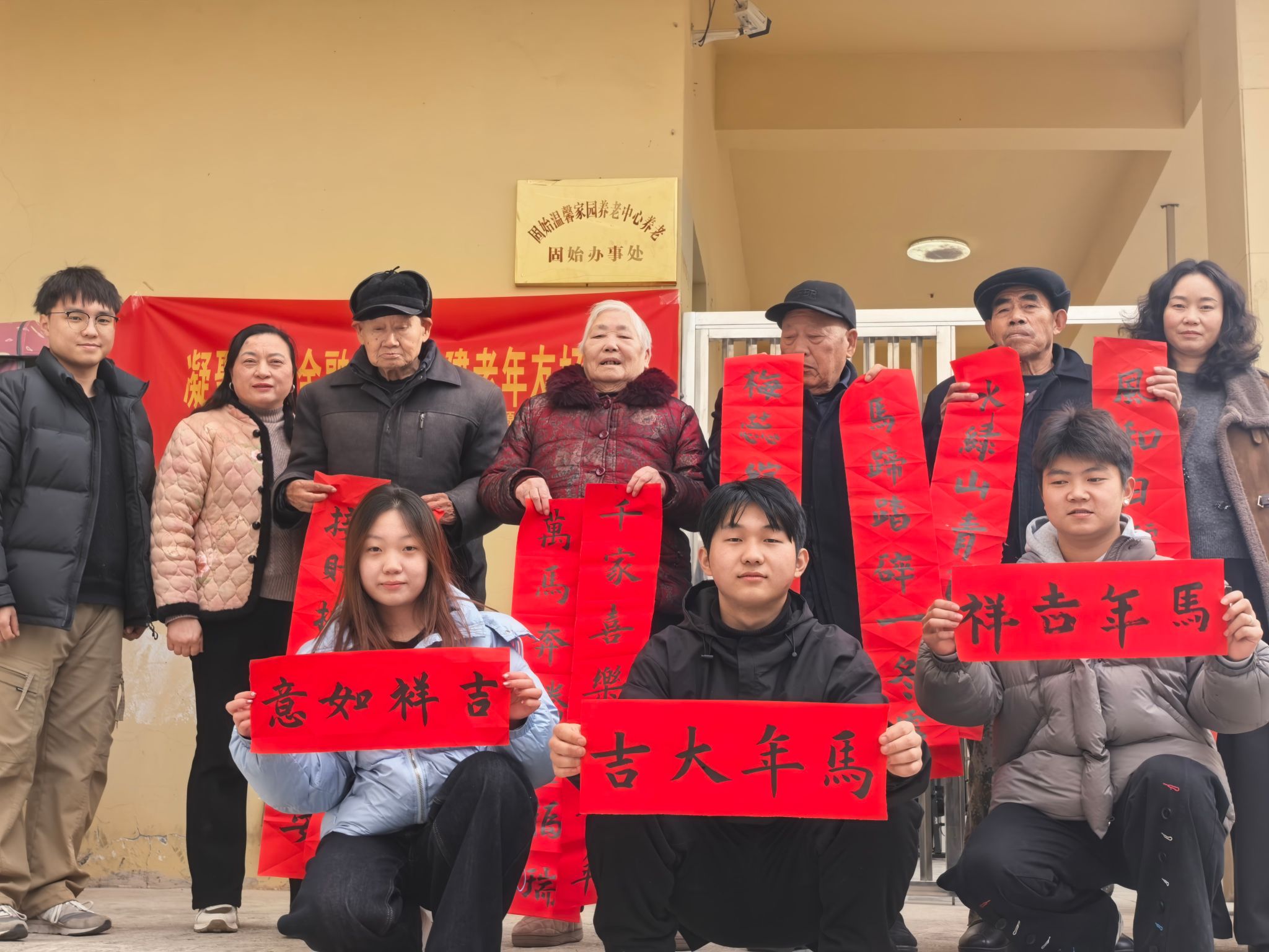 活动现场暖意融融,书法社团的同学们铺展红纸、研磨挥毫,以娴熟的笔法创作春联。一幅幅笔力遒劲、寓意吉祥的春联跃然纸上,氤氲的墨香中承载着对老人们的美好祝愿。同学们每一笔都饱含真诚,每一幅都凝聚心意。老人们围在桌旁,看着春联上喜庆的文字,脸上洋溢着幸福的笑容,不时称赞同学们的书法功底,现场欢声笑语不断。