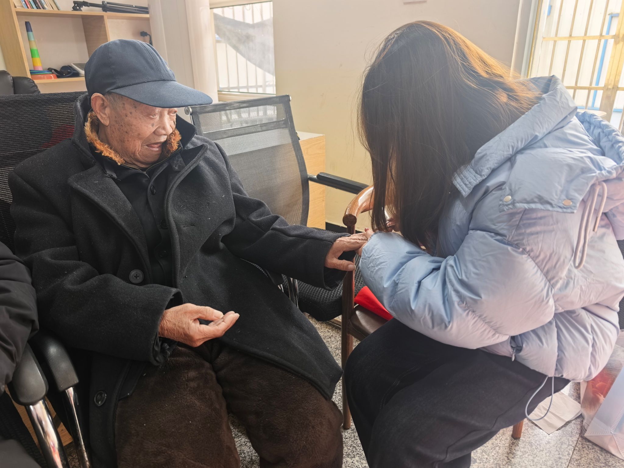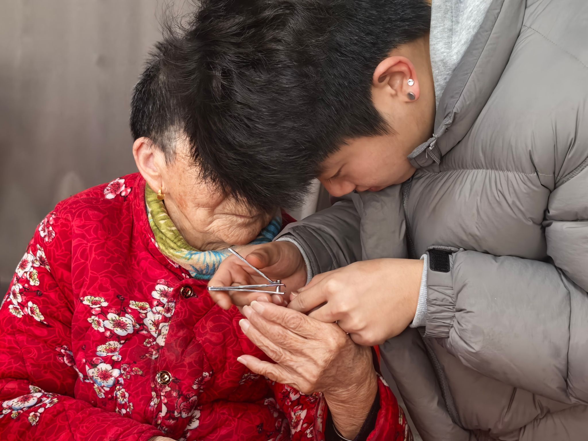 写罢春联,师生们分组为老人们送上这份特殊的“文化年货”,并耐心细致地为老人修剪指甲。“爷爷,您慢点抬手,我轻一点剪”“奶奶,指甲剪短一点更方便生活”,同学们俯下身来,握着老人布满皱纹的手,小心翼翼地修剪、打磨,动作轻柔而认真。修剪过程中,大家还与老人们亲切交谈,关切询问他们的饮食起居和身体状况,倾听老人讲述过往的故事,陪伴他们唠家常、话温暖,养老院里处处涌动着尊老爱老的温情暖流。