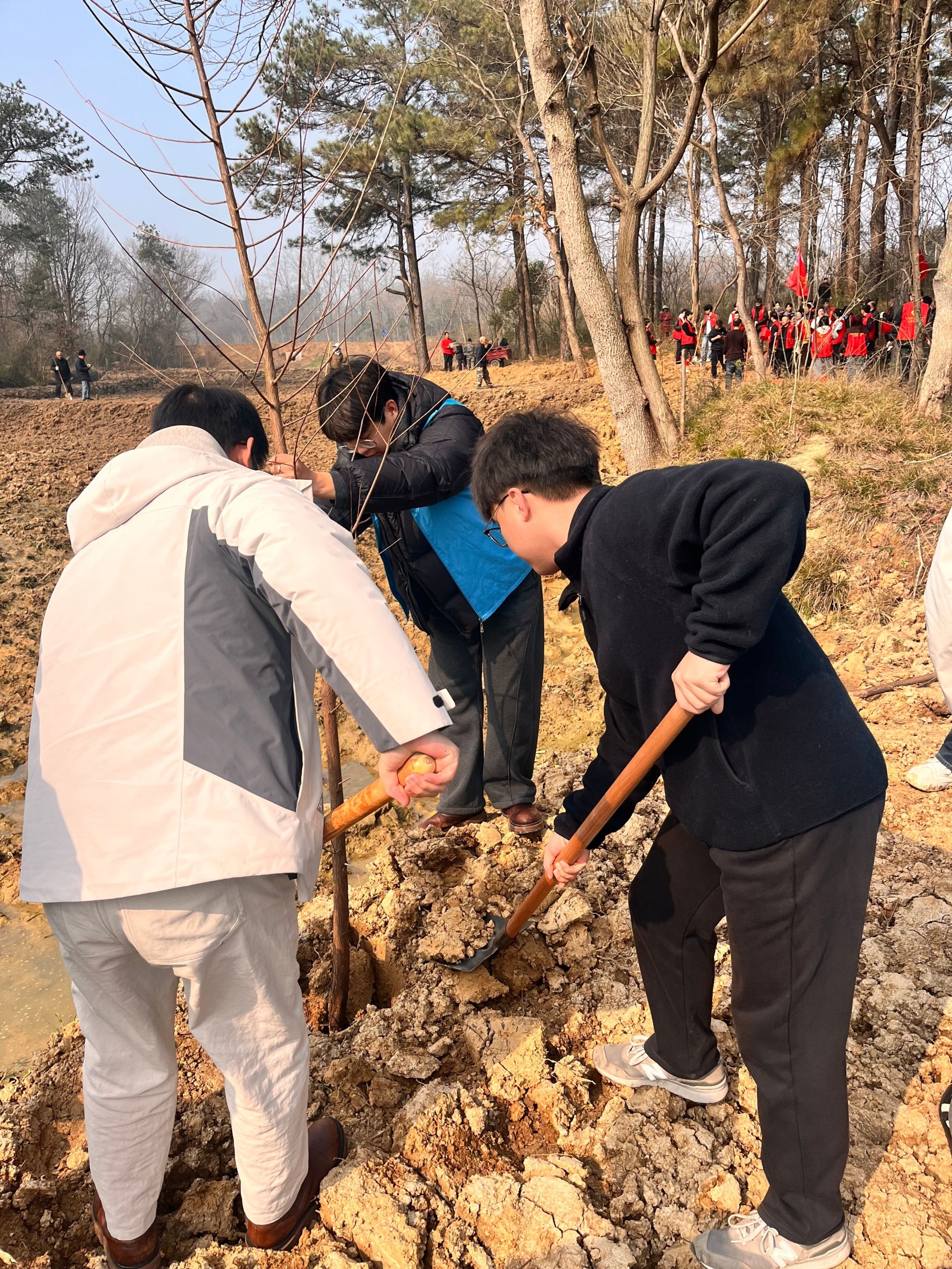 活动现场,党旗与团旗交相辉映,来自三方的参与者迅速组成植树小分队。在林场技术人员的专业指导下,志愿者们认真学习挖坑深度、扶苗角度、填土压实等栽种技巧,随后分工协作、默契配合:挥锹挖坑时干劲十足,扶苗定位时细致严谨,培土浇水时有条不紊。尽管泥土沾满鞋裤、汗水浸湿衣衫,但同学们热情不减,穿梭在林区的身影成为春日里最鲜活的风景线。有的同学主动承担重活累活,有的则细心清理树苗周边杂草,还有的相互传授栽种经验,欢声笑语与铁锹碰撞土壤的声响交织,奏响了青春护绿的和谐乐章。据统计,本次活动共栽种樱花、雪松等苗木百余株,为杨店林区这片“白鹭园”增添了一抹亮丽的生态底色。