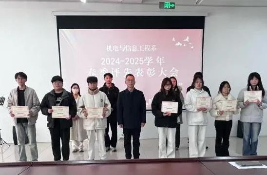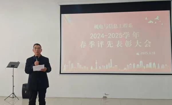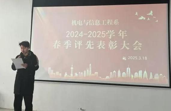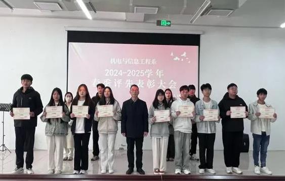 3月18日下午,机电与信息工程系在鲁班楼阶梯教室召开2024-2025学年春季评先表彰大会,表彰在学业、管理、科技创新及集体建设中表现突出的先进个人与集体。系副主任文琳、辅导员韩文龙、张盼盼、周双双、唐垒以及获奖学生齐聚一堂,共同见证这一荣耀时刻。