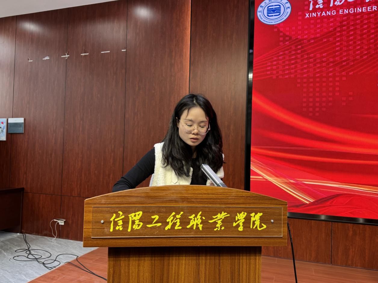 文明班集体获奖代表--新能源3班班主任孟雪莹老师上台发言,勉励全体同学以先进为榜样,勤学善思、严守纪律、涵养品德,将文明习惯融入日常,在成长路上不断提升自我。