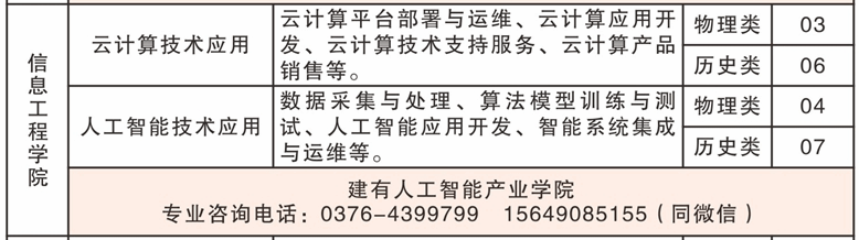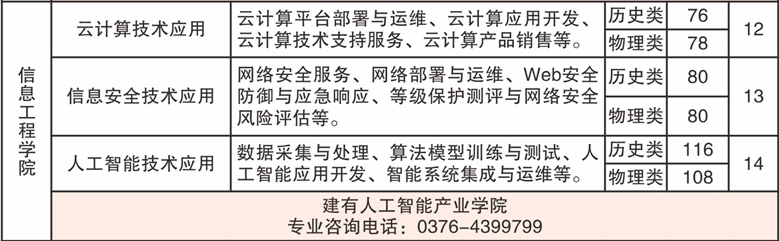 信息工程学院是根据《河南省“十四五”数字经济和信息化发展规划》、《河南省深化新一代信息技术与制造业融合实施方案》等文件所构建的河南省电子信息产业发展框架,围绕数字产业化、产业数字化、基础设施升级三大主线,持续壮大河南电子信息产业集群,推动数字经济与实体经济深度融合,打造全国重要的电子信息产业高地等对电子信息和计算机人才的需要,紧密对接我省制造业 “7+28+N”群链建设、信阳先进制造业发展对人才的需求,依据学校五年专业建设发展规划成立的院系,也是学校重点发展的院系。本院现有23级计算机应用技术专业在校学生100余人,2025年设置三个招生专业:人工智能技术应用、云计算技术应用、信息安全技术应用。