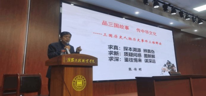 为了贯彻党的二十届四中全会要求,推动中华优秀文化创造性转化和创新性发展,4月14日下午,信阳工程职业学院校园内书香氤氲、思想激荡。受学校邀请,信阳市委党校兼职教授、信阳市老干局“银龄”宣讲团成员、信阳市老科协副会长张传明教授莅临校园,为在校大学生带来了一场题为《品三国故事,传中华文化》的专题讲座,共赴一场跨越千年的文化之约。