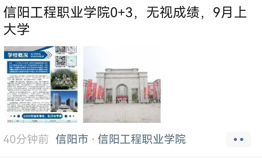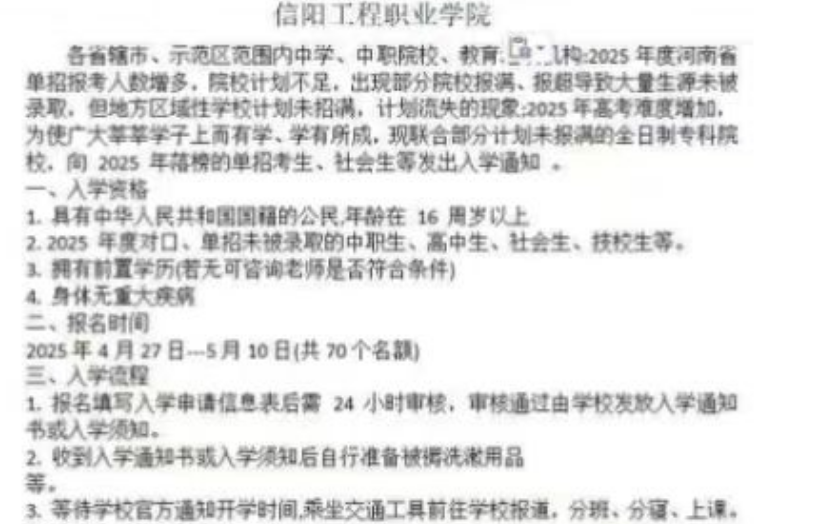 近期,社会上一些机构和个人冒用“信阳工程职业学院”名义,通过微信、QQ、抖音、小红书、快手等社交平台存,发布招收“0+3”、“1+3”、“预科”学生等虚假信息(附件),误导公众,严重损害学校声誉、侵犯学校权益,对此,我校严正声明: