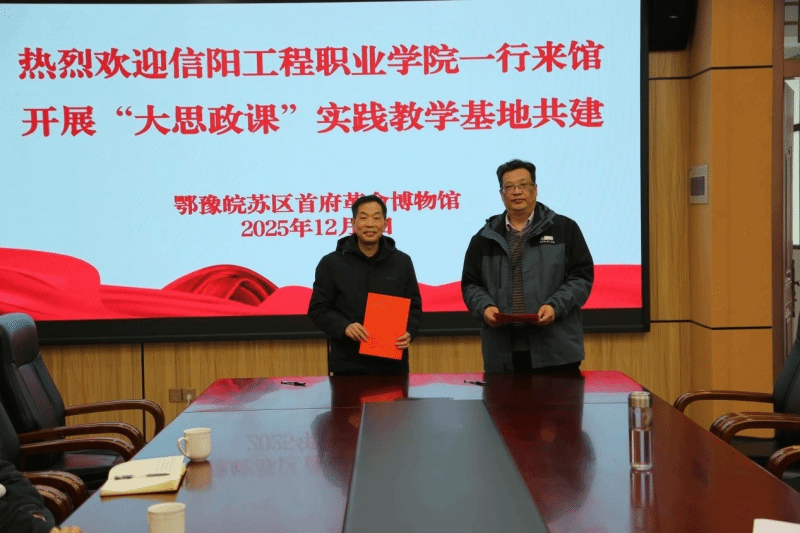12月4日,信阳工程职业学院“大思政课”实践教学基地签约揭牌仪式在鄂豫皖苏区首府革命博物馆举行。此次校馆携手,旨在深度挖掘红色资源育人价值,推动思政小课堂与社会大课堂有机融合,为落实立德树人根本任务搭建重要平台。鄂豫皖苏区首府革命博物馆副馆长李森,信阳工程职业学院常务副校长杨金国等双方工作人员、教师代表共同出席仪式。