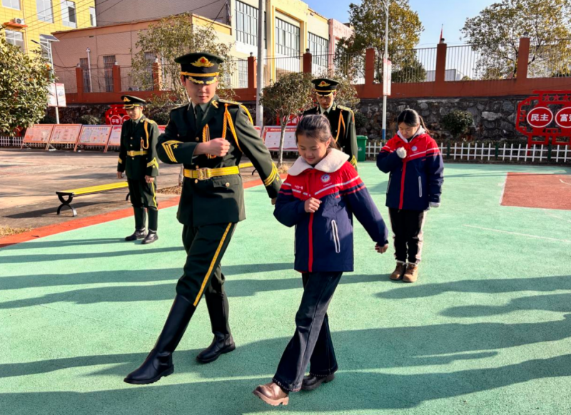 仪式落幕,温情互动的大幕随即拉开。在师生的见证与鼓励下,国旗班队员主动走近孩子们,化身耐心细致的“小老师”。他们纷纷蹲下身,与孩子们平视相对,手把手地教孩子们练习“抬头、挺胸、齐步走”等队列动作。考虑到孩子们的接受能力,队员们特意放慢节奏,用夸张的口型辅助理解、用轻柔的手势传递指令,配合耐心细致的讲解,一遍又一遍示范、纠正动作。从最初的懵懂生疏,到渐渐跟上节奏,当孩子们终于能勉强走出整齐的小步子时,队员们立刻用提前学好的手语比出“你真棒”。收到赞许的瞬间,孩子们的脸上瞬间绽放出灿烂又纯粹的笑容,眼眸里盛满了喜悦的光芒。