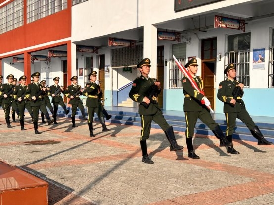上午九时十分,升旗仪式正式开始。激昂雄壮的《义勇军进行曲》奏响,信阳工程职业学院国旗班队员身着挺拔制服,迈着铿锵有力、整齐划一的步伐,昂首挺胸护卫着鲜艳的五星红旗走向升旗台。当五星红旗冉冉升起,全体人员肃立行注目礼:领导神情庄重,国旗班队员目光坚定,孩子们虽无法清晰吟唱国歌,却用澄澈透亮的眼眸紧紧追随着国旗攀升的身影,稚嫩的小手不自觉地攥紧衣角,脸庞上满是与生俱来的庄重与崇敬。这一刻,猎猎飘扬的五星红旗,不仅是家国情怀的鲜明象征,更化作连接爱心与希望的温暖纽带,将两颗心紧紧相连。