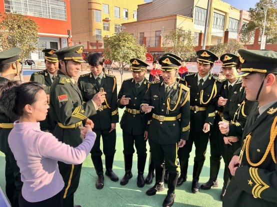 为打破交流壁垒,让沟通更顺畅,国旗班队员们提前向手语老师请教,学会了“你好”“加油”“很高兴认识你”等基础手语,在活动现场主动与孩子们交流。此刻,这些简单的手势成为了最温暖的语言:一个赞许的眼神,传递着认可与鼓励;一次轻轻的击掌,定格着默契与亲近;一段笨拙却真诚的手语对话,让平日里在无声世界里默默成长的孩子们,感受到了前所未有的关注与温暖。他们渐渐褪去羞涩,不再躲闪,纷纷主动拉着队员们的手,有的用活泼的肢体动作分享自己的快乐,有的小心翼翼地戴上礼兵帽、握住礼兵枪,兴奋地与大哥哥们合影留念。