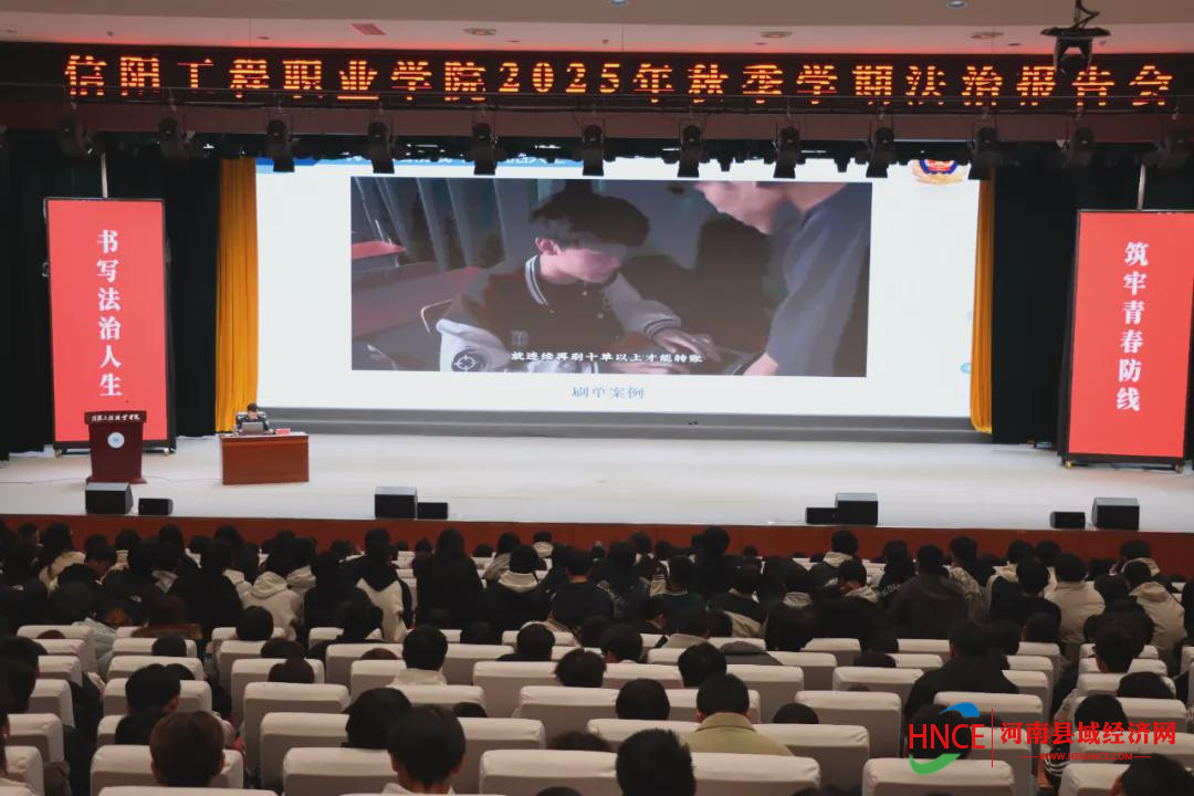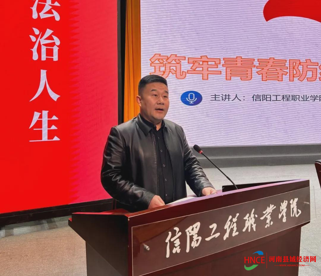 为进一步推动法治教育宣传活动,弘扬法治精神,普及法律知识,增强学生防范和应对风险意识及能力,10月21日下午,信阳工程职业学院特邀校法治副校长、县公安局党委副书记、政委李东同志,开展以 “筑牢青春防线、书写法治人生” 为主题的法治报告会。报告会由副校长徐俊杰主持,各学院副院长、辅导员、班主任及2025级全体新生聆听了报告会。