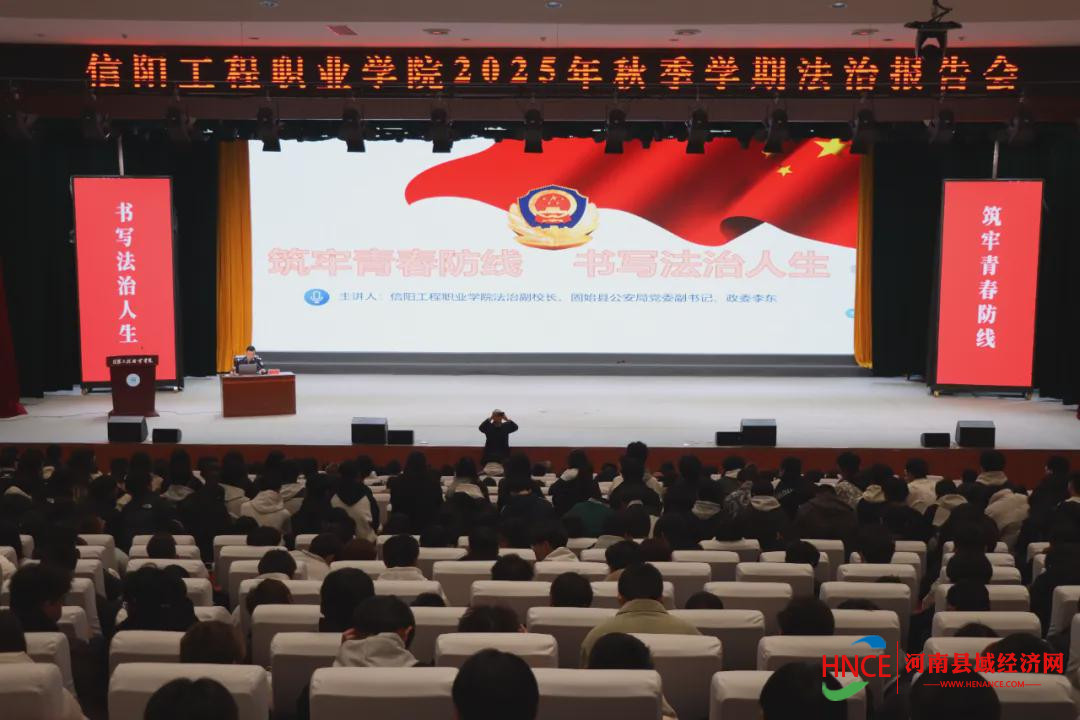 河南县域经济网讯 为进一步推动法治教育宣传活动,弘扬法治精神,普及法律知识,增强学生防范和应对风险意识及能力,10月21日下午,信阳工程职业学院特邀校法治副校长、县公安局党委副书记、政委李东同志,开展以 “筑牢青春防线、书写法治人生” 为主题的法治报告会。报告会由副校长徐俊杰主持,各学院副院长、辅导员、班主任及2025级全体新生聆听了报告会。