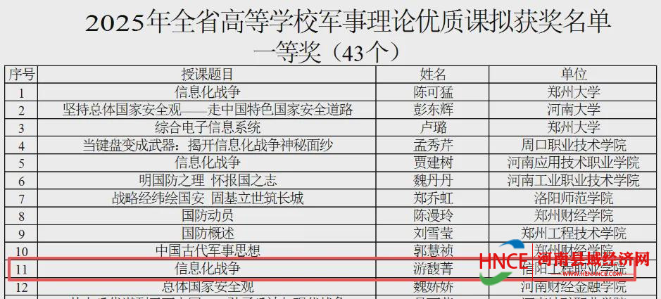 近日,河南省教育厅、河南省军区战备建设局联合公布 2025 年度全省高等学校军事理论优质课获奖名单,信阳工程职业学院马克思主义学院游馥菁老师凭借出色的军事理论教学设计与课堂呈现,斩获一等奖。