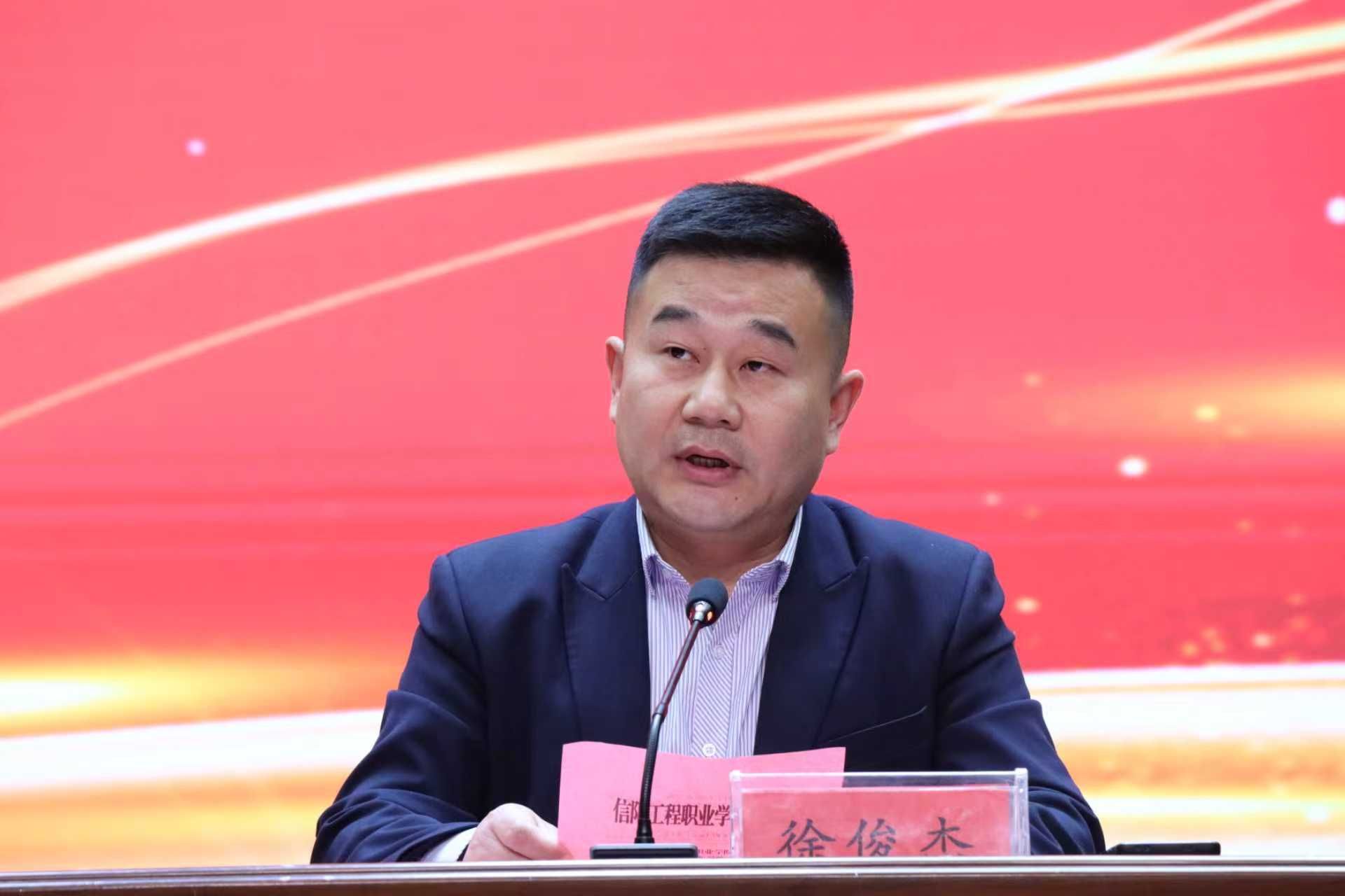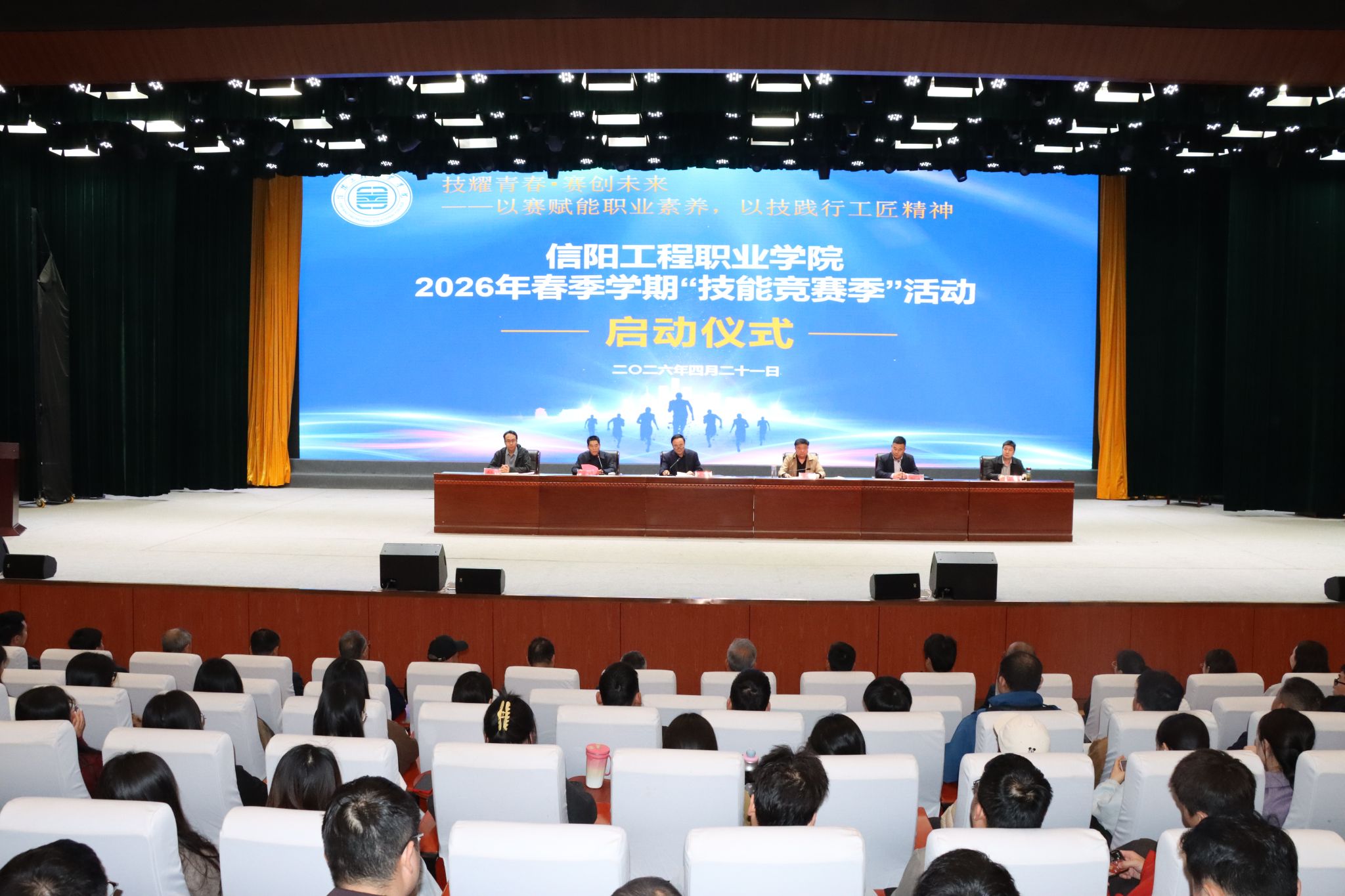 为深化职业教育教学改革,落实“以赛促教、以赛促学、以赛促创、赛教一体”育人理念,4月21日下午,信阳工程职业学院2026年春季学期“技能竞赛季”启动仪式在百花厅隆重举行。校长黄功学,副理事长、副校长张东斌,副校长徐俊杰出席并讲话,副校长杨金国主持仪式,全体校领导、中层干部及师生代表参加活动。