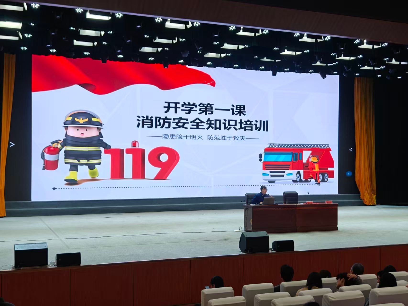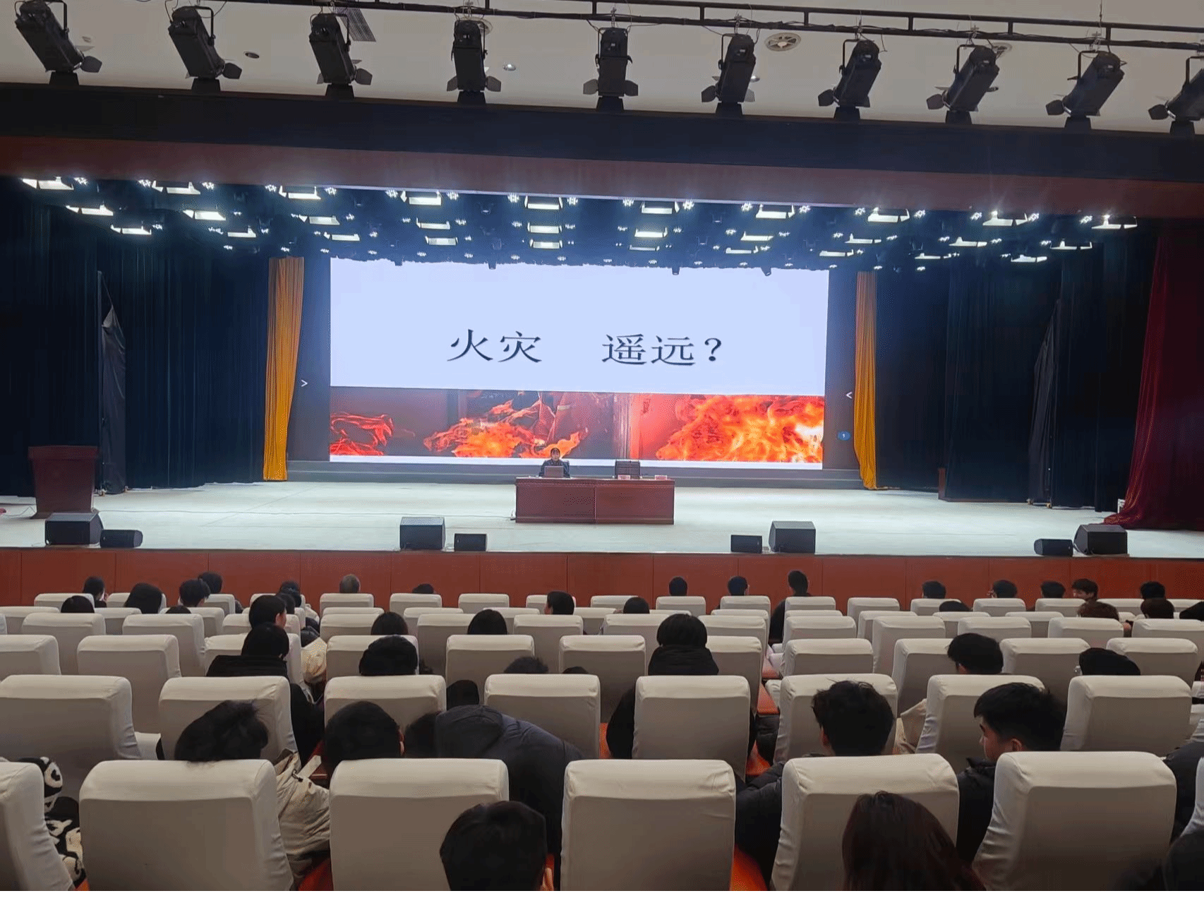 本次培训特邀固始县消防大队宣传办缪东汝同志主讲,各二级学院院长、辅导员、宿管员、宿舍长及学生代表共约 900 人参加培训。